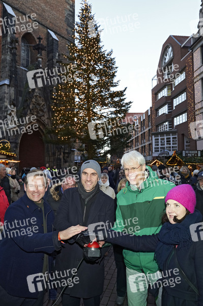 Kevin Kratzsch (Vizepräsident Deutscher Schaustellerbund), Belit Onay (Oberbürgermeister von Hannover), Rainer Müller-Brandes (Stadtsuperintendent), Dany Schrader (Chefredakteuriin Hannoversche Allgemeine) bei der Eröffnung des Weihnachtsmarktes 2022 an der Marktkirche. Hannover, 21.11.2022