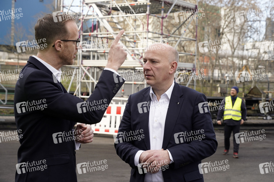 Christian Feuerherd und Kai Wegner bei der Grundsteinlegung einer Abwassergroßwärmepumpe von Vattenfall und Befüllen einer Zeitkapsel auf dem Kraftwerksgelände Reuter-West. Berlin, 12.03.2024