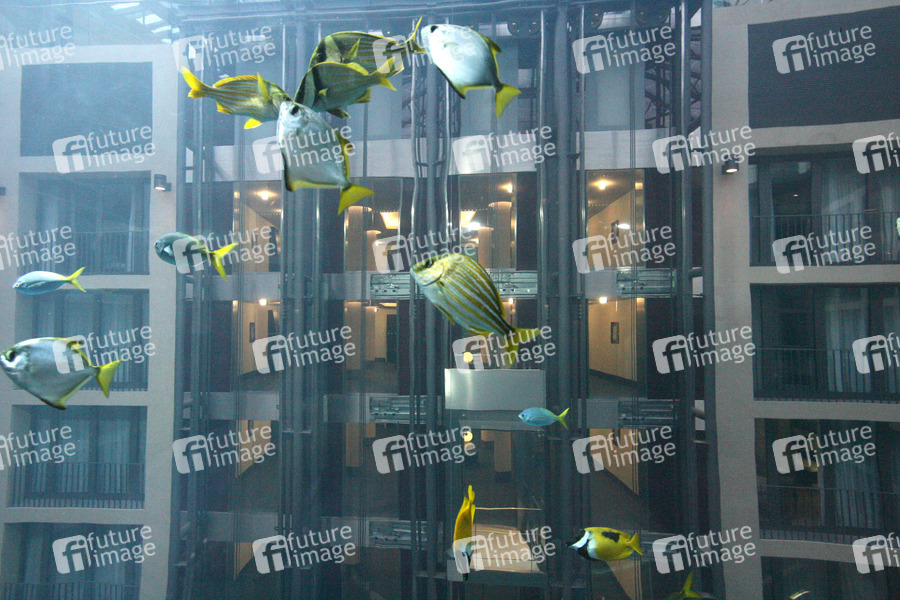 Ein Fahrstuhl fährt in etwa fünf Minuten mitten durch eine 25 m hohe Aquariumssäule in der Hotelhalle, das größte Zylinderaquarium der Welt, eine Million Liter mit 2700 Fischen, 2000 Tonnen Gewicht auf 6 qm Standfläche, 22 cm dicke Acrylscheiben, Lippfische, Doktorfische, Kaiserfische, Bodenguckermakrelen, Sägebarsche