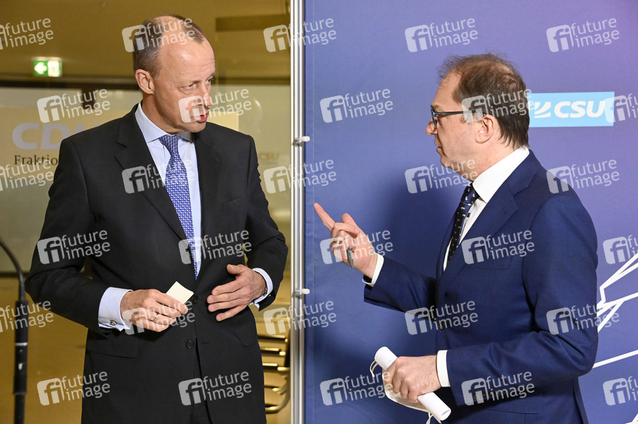 Friedrich Merz und Alexander Dobrindt beim Statement der CDU/CSU-Bundestagsfraktion nach der fraktionsoffenen Sitzung auf der Fraktionsebene im Reichstagsgebäude. Berlin, 24.02.2022