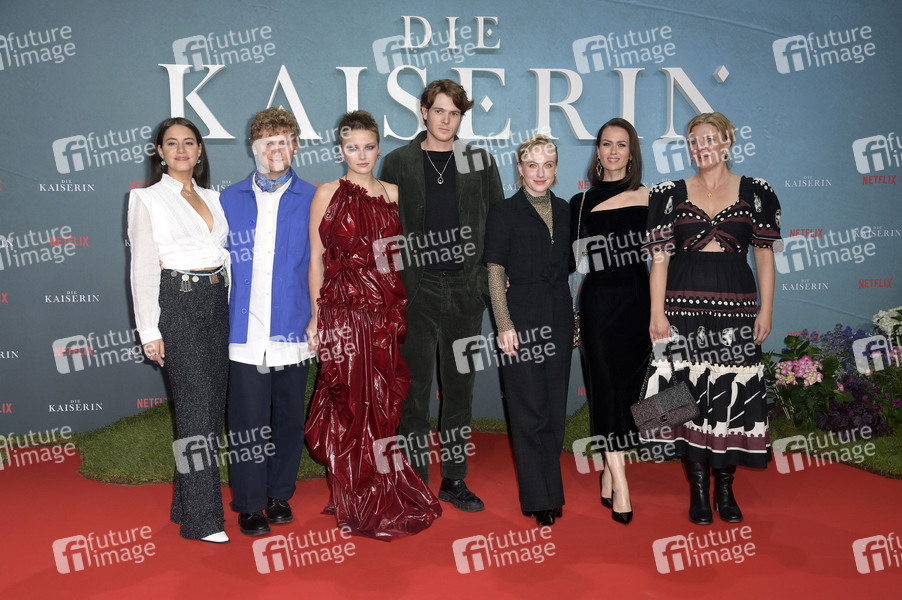 Almila Bagriacik, Johannes Nussbaum, Devrim Lingnau, Philip Froissant, Elisa Schlott, Melika Foroutan und Jördis Triebel beim Influencer Event zur Netflix-Serie 'Die Kaiserin' in der Großen Orangerie vom Schloss Charlottenburg. Berlin, 23.09.2022