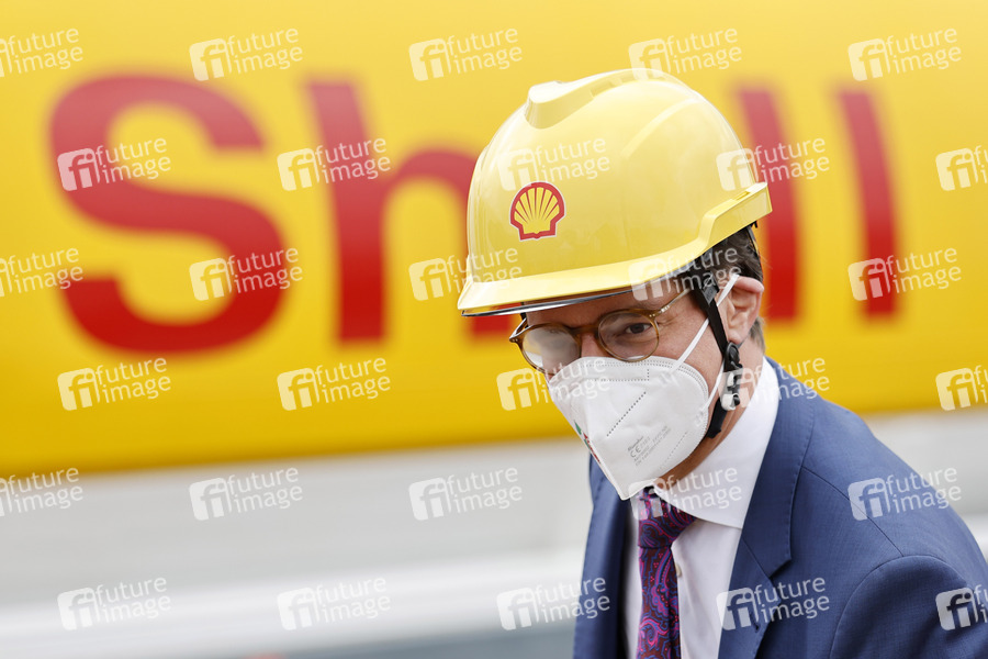 Politiker, CDU, Union, Ministerpräsident des Landes Nordrhein-Westfalen, NRW-Ministerpräsident, Auftritt, Shell, Industrie, Raffinerie, Royal Dutch Shell, Produktionsanlage, Gaskonzern, Gasindustrie, Ölindustrie, Ölkonzern, Treibstoff, Klimaziele, Förderung, Energiewende, Chemieindustrie, Kohlendioxid-Ausstoß, Gas, Erneuerbare Energien, Umweltschutz, Energietechnik, Umweltpolitik, Gaspreis, Gaspreise, Industriepolitik, Energiepolitik, Shell Energy, Chemicals Park Rheinland, CO2-neutral, Nachhaltigkeit, CO2-Neutralität, Biogas, Bio-Gas, Bio-LNG, flüssiges Gas, Biomethan, Methangas, Methan-Gas, Baustelle, Helm, Bauarbeiterhelm