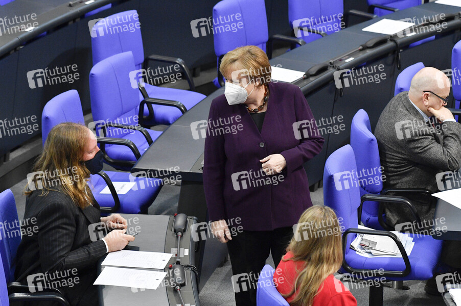 Anton Hofreiter und Angela Merkel in der 205. Sitzung des Deutschen Bundestages im Reichstagsgebäude. Berlin, 27.01.2021