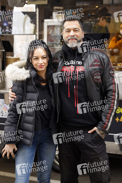 Aurelio Savina mit Freundin Larissa bei der Eröffnung von 'Willi Herren's Rievkooche Bud'. Willi Herren stellt seinen Reibekuchen-Truck am Gelände der Selgros vor. Köln, 16.04.2021