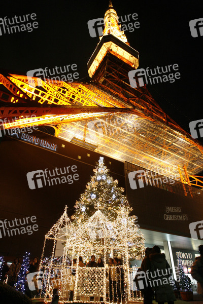 Der 1958 von der Takenaka Corporation fertig gestellte Stahlfachwerkturm ähnelt dem etwas niedrigeren Pariser Eiffelturm, dient als Sendestation für 23 Radio- und Fernsehsignale, Höhe ca. 333m, verfügt über zwei vollständig verglaste Plattformen in 150m und 250m Höhe, ist als Luftfahrthindernis orange und weiß bemalt, Weihnachten, Christmas, Weihnachtsbaum