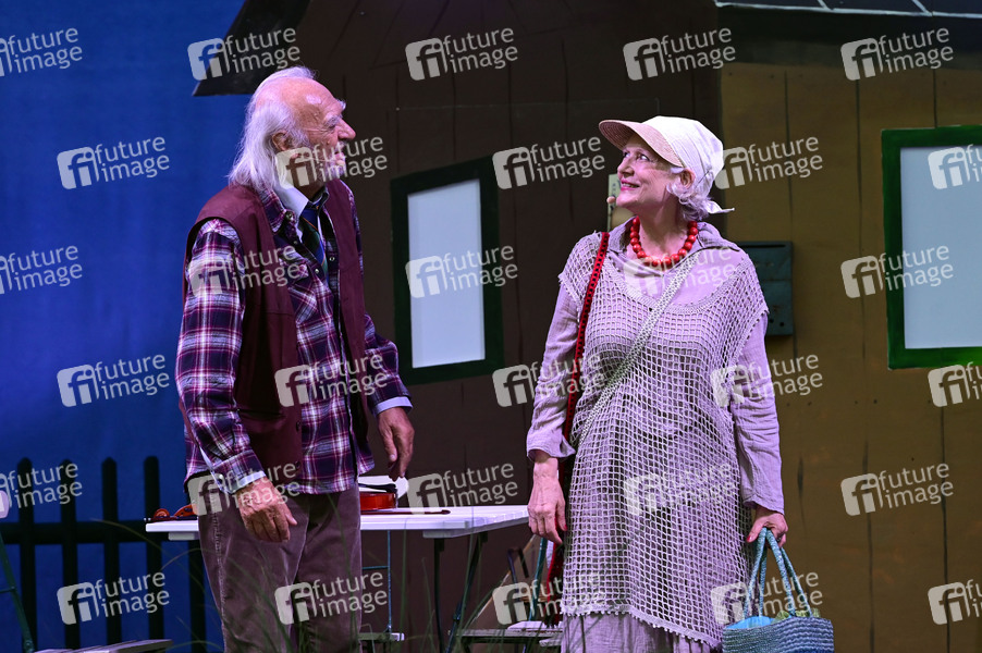 Achim Wolff und Rita Feldmeier bei der Premiere des Theaterstücks 'Maxe Baumann - Ferien ohne Ende' während der Beelitzer Festspiele 2025 auf der Freilichtbühne. Beelitz, 14.08.2025
