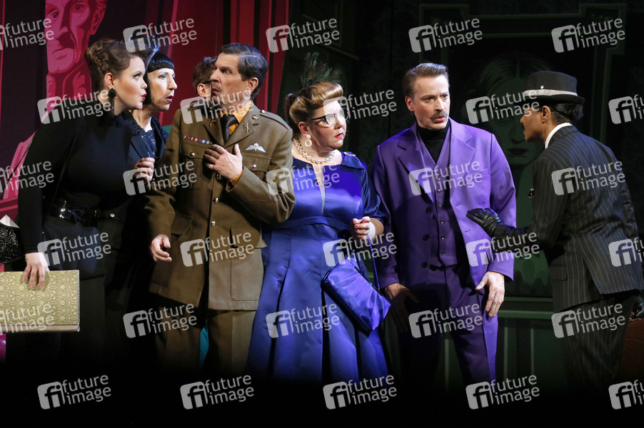 Lilian Siebert, Katharina Blaschke, Jörg Seyer, Mackie Heilmann, Max von Pufendorf und Adisat Semenitsch bei der Fotoprobe zum Theaterstück 'Cluedo - Das Mörderspiel' in der Komödie am Kurfürstendamm im Theater am Potsdamer Platz. Berlin, 14.03.2024