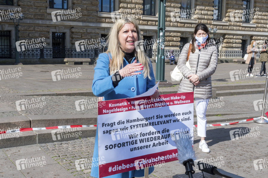 Yvonne Guberinic, Mitorganisatorin und Inhaberin vom Beautysalon WunderSchön, bei der Demonstration der Beautybranche und Tattoostudios vor dem Rathaus für die Erlaubnis der Wiedereröffnung ihrer Geschäfte. Hamburg, 12.05.2020