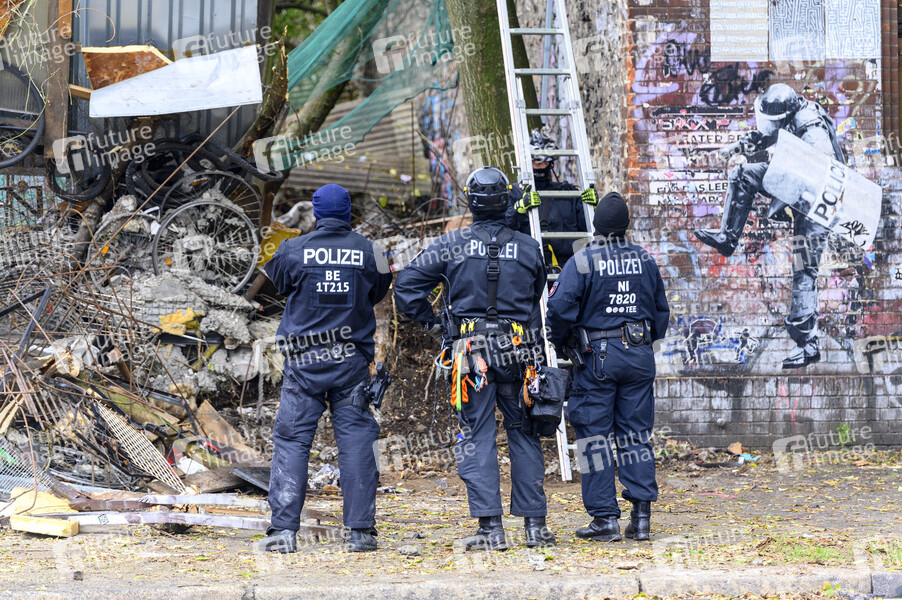 Räumung des linksautonomen Wagenplatzes 'Köpi'. Die Bewohner hatten im Vorfeld angekündigt, sie wollen nicht kampflos aufgeben. Rund eine Stunde haben die Barrikaden des linksautonomen Wagencamps gehalten, dann durchbrach die Polizei den Zaun an mehreren Stellen. Es gab Festnahmen. Berlin, 15.10.2021