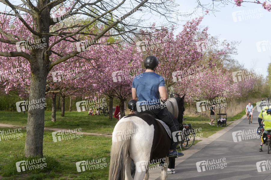Blühende Japanische Kirschbäume entlang der TV-Asahi-Kirschblütenallee am Berliner Mauerweg im Stadtteil Lichterfelde und Teltow. Berlin, 07.04.2024
