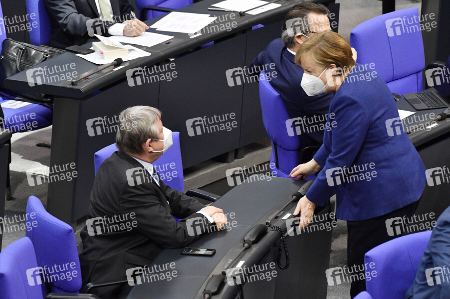 Hermann Gröhe und Angela Merkel in der 212. Sitzung des Deutschen Bundestages im Reichstagsgebäude. Berlin, 25.02.2021