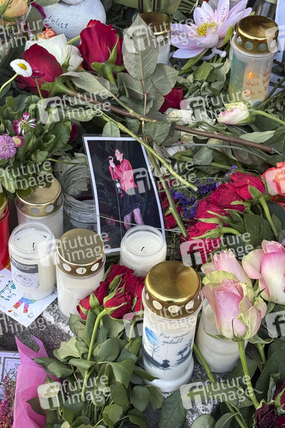 Blumen, Kerzen und Fotos sind an einem Gedenkort für die verstorbene Rosenstolz-Sängerin AnNa R. am Theater des Westens zu sehen. Die Sängerin wurde 55 Jahre alt. Berlin, 22.03.2025