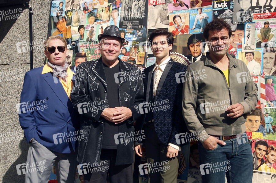 Ben Becker, Rosa von Praunheim, Kilian Berger und Kai Schumann beim Fototermin am Set des ARD Dokudramas 'Der letzte Tanz - Die Rex-Gildo-Story' auf dem rbb-Gelände. Berlin, 16.08.2021