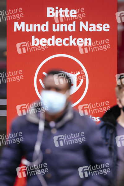 Am Düsseldorfer Hauptbahnhof fordern Schilder der Deutschen Bahn Reisende dazu auf: 'Bitte Mund und Nase bedecken'. Auch in Fußgängerzonen und auf öffentlichen Plätzen gilt bei einem erhöhten R-Wert Maskenpflicht. (Themenbild, Symbolbild) Düsseldorf, 09.10.2020