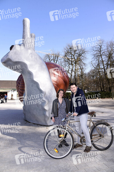 Christina Schmideder und Max Kronseder (DeSchoWieda) beim Videodreh zum Lied 'Radlg'fahrn und G'schmissn' der Guten A-Band im Bavariapark und auf der Theresienwiese. München, 26.03.2021