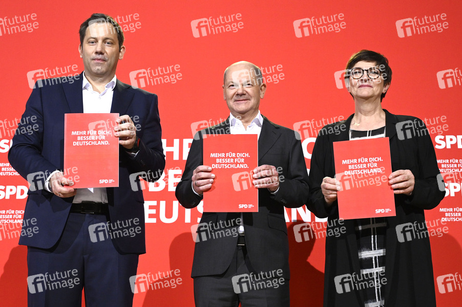 Lars Klingbeil, Olaf Scholz und Saskia Esken bei der Pressekonferenz zum Beschluss des SPD-Wahlprogramms für die Bundestagswahl 2025 im Willy-Brandt-Haus. Berlin, 17.12.2024