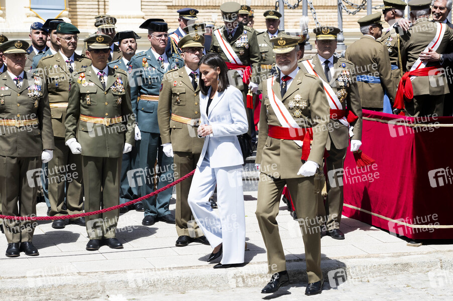 Königin Letizia von Spanien und König Felipe VI. von Spanien beim 40. Jahrestag der Vereidigung des Königs in der spanischen Armee beim 44. Jahrgang der Academia General Militar de Zaragoza. Saragossa, 04.05.2024