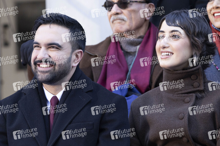 Zohran Mamdani mit Ehefrau Rama Duwaji bei der Amtseinführung des ersten muslimischen Bürgermeisters von New York City in Rathaus. New York, 01.01.2026