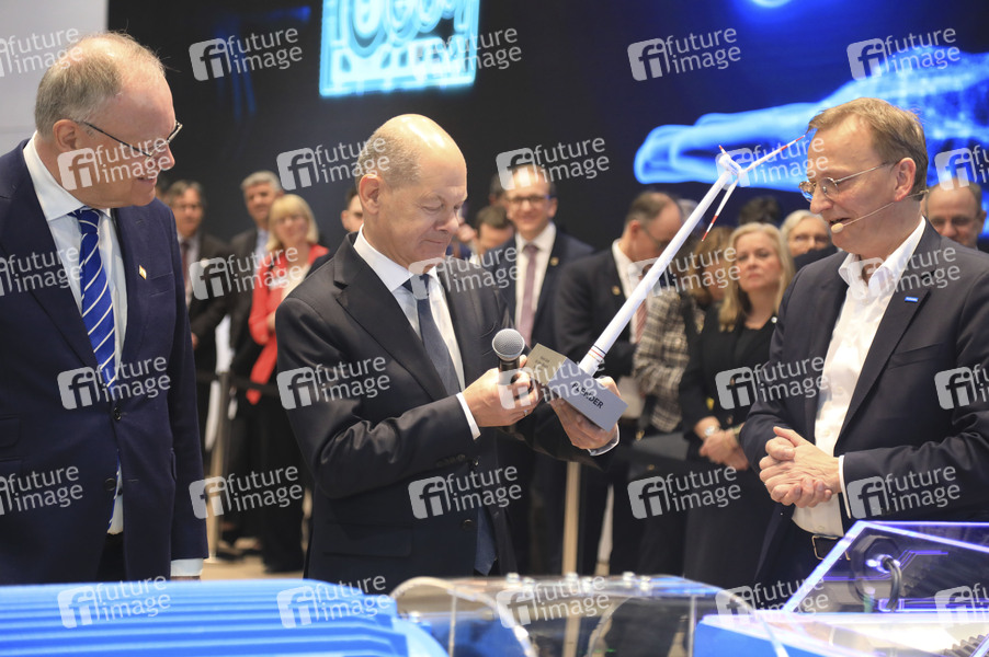 Stephan Weil, Olaf Scholz und Andreas Evertz am Stand der Firma Flender beim Eröffnungsrundgang auf der Hannover Messe 2025 auf dem Messegelände. Hannover, 31.03.2025