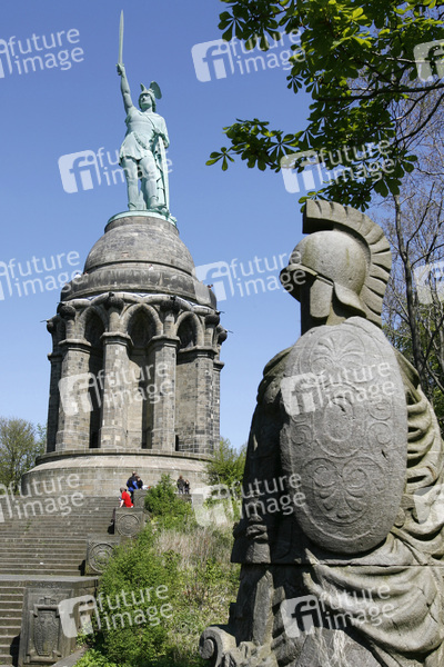soll an den Cheruskerfürsten Arminius (Lateinisch, in deutsch: Hermann) erinnern, Gesanthöhe 53.46 m, Sandsteinunterbau 26.89m, Figur 26.57 m, besteht aus einer Eisenrohrkonstruktion mit Oberfläche aus Kupferplatten, Erbauer Ernst von Bandel, Baubeginn 1838, nach der Revolution von 1848 ruhte der Bau bis 1863, festliche Einweihung 1875