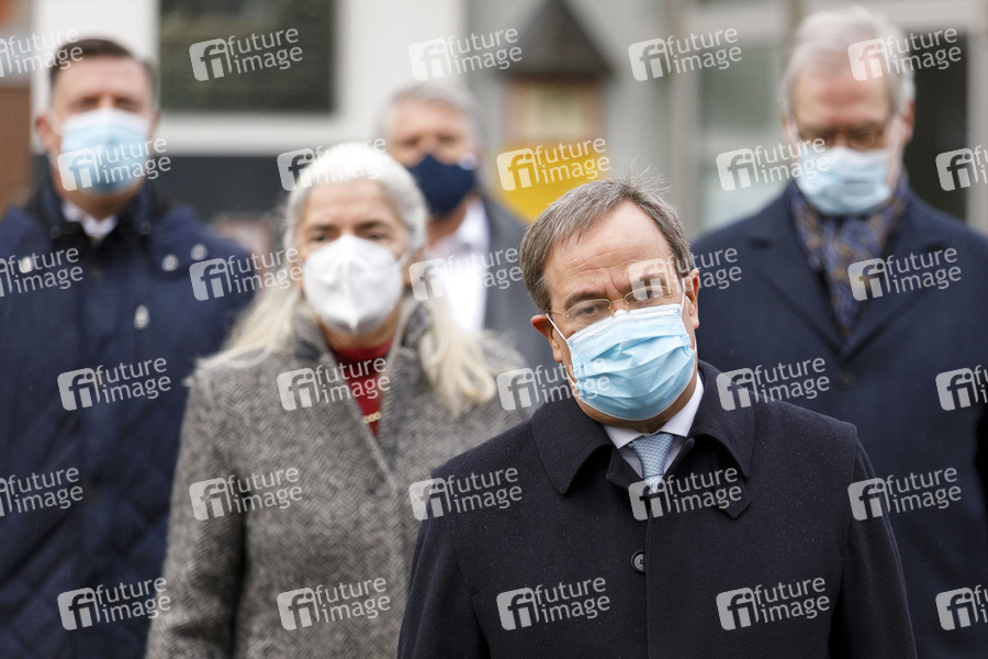 Isabel Pfeiffer-Poensgen und Armin Laschet bei einem Pressestatement vor dem Universitätsklinikum Düsseldorf. In Rekordzeit hat das UKD eine räumlich vollständig getrennte Neubau-Einheit zur Versorgung von COVID-19-Patienten erbaut. Das Gebäude bietet 18 Intermediate-Care-Plätze und 25 Intensivplätze. Damit verfügt das Universitätsklinikum über eine der modernsten Intensiveinheiten Europas. Düsseldorf, 30.12.2020