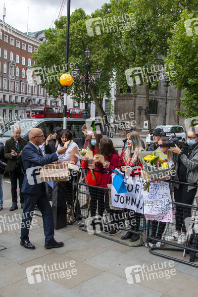Johnny Depps Team verteilt vor dem High Court of Justice von Depp signierte Souvenirs an Fans anlässlich des letzten Prozesstages der Verleumdungsklage Johnny Depp gegen die Zeitung The Sun. London, 28.07.2020