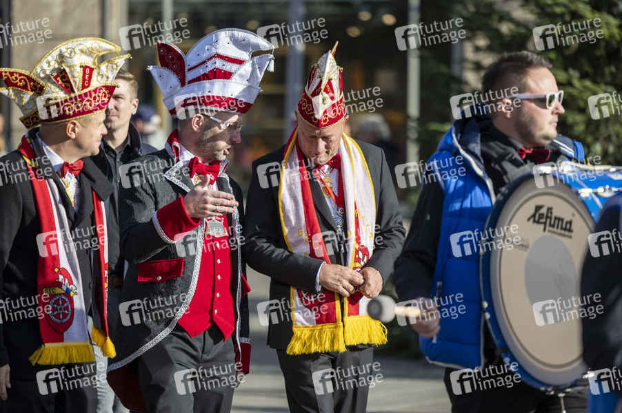 Christoph Matthes (Präsident Landesverband Thüringer Karnevalvereine) im Gespräch mit GEC-Präsident Thomas L. Kemmerich. beim Start des Erfuter Karnevals mit einem Mini-Umzug von ca. 2000 Erfurter Karnevalisten vom Hotel Radisson Blu über den Anger zum Fischmarkt vors Rathaus. Erfurt, 11.11.2022