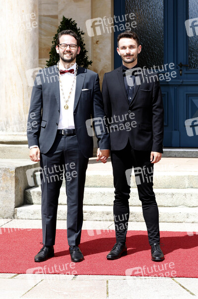 Andreas Zippel mit Partner Luca Maaß bei der Eröffnung der 112. Richard-Wagner-Festspiele 2024 mit der Neuinszenierung von 'Tristan und Isolde' im Bayreuther Festspielhaus. Bayreuth, 25.07.2024