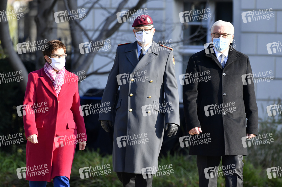 Annegret Kramp-Karrenbauer, General Eberhard Zorn und Frank-Walter Steinmeier bei der Ansprache des Bundespräsidenten beim Feierlichen Gelöbnis zum 65. Gründungstag der Bundeswehr vor dem Schloss Bellevue. Berlin, 12.11.2020