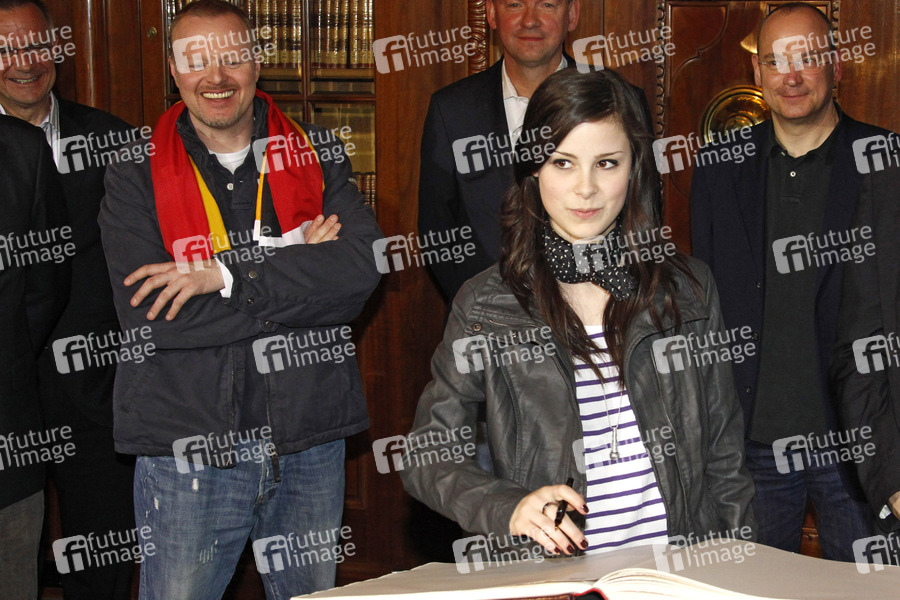 Nach ihrem Sieg beim Eurovision Song Contest in Oslo, trägt sich die Siegerin Lena ins Goldene Buch der Stadt Hannover ein