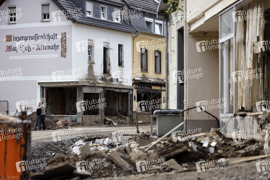 Nach dem Jahrhunderthochwasser in der Eifel durch heftige Regenfälle und Dauerregen mit Überschwemmungen und Überflutungen haben die Aufräumarbeiten im Ahrtal große Fortschritte gemacht. Einheiten von Polizei, THW, Bundeswehr und Feuerwehr mitsamt vielen freiwilligen Helfern haben Straßen geräumt, Schutt und Schlamm entfernt und die Menschen versorgt. Der Wiederaufbau wird trotzdem Jahre dauern. Im Bild Flutschäden in der Ortschaft Mayschoß, in der die Flut viele Häuser zerstörte, 08.08.2021