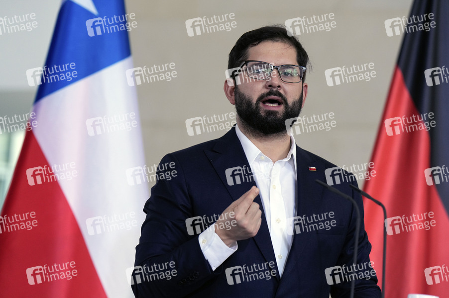 Gabriel Boric beim Empfang des Präsidenten von Chile mit militärischen Ehren und zu einem gemeinsamen Gespräch mit dem Bundeskanzler mit anschließendem Pressestatement im Bundeskanzleramt. Berlin, 10.06.2024