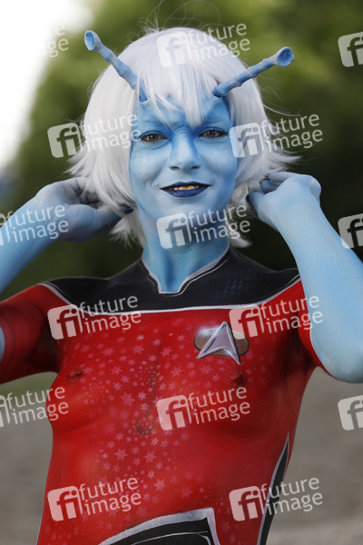 Cosplay, Cosplayer, Bodypainting, Body-Painting, Make-up, Latexappliaktionen, Maskenbildnerei, Körperkunst, Körperfarben, Projekt Farbkörper, Farbe, Bemalung, Kunst, Malerei, Star Trek, Trekkies, Trekker, Alien, Aliens, Andorianerinnen, Science Fiction, Andorian, humanoid extraterrestrial, body painting, body art, project color body, colors