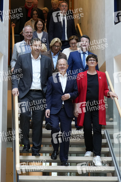 Matthias Miersch, Lars Klingbeil, Katja Mast, Svenja Schulze, Olaf Scholz, Klara Geywitz, Hubertus Heil und Saskia Esken bei der Klausur des SPD-Parteivorstandes im Willy-Brandt-Haus.Berlin, 13.10.2024