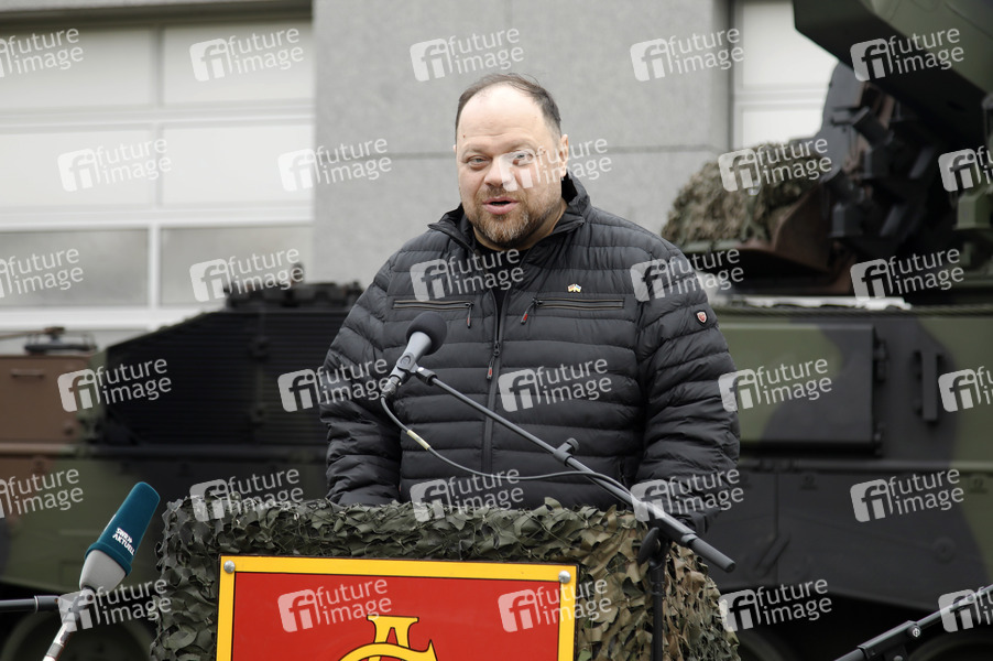 Ruslan Stefantschuk beim gemeinsamen Besuch der Bundestagspräsidentin mit dem ukrainischen Parlamentspräsident in der Artillerieschule der Bundeswehr in Idar-Oberstein. Idar-Oberstein, 12.10.2025