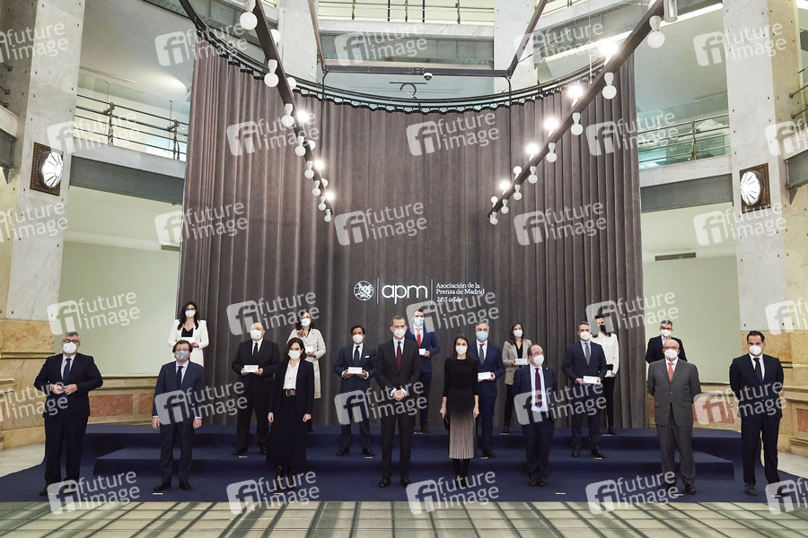 König Felipe von Spanien und Königin Letizia von Spanien mit den Preisträgern, bei der Verleihung der APM Awards der Madrid Press Association im Palacio de Cibeles. Madrid, 09.02.2021