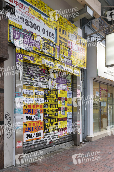 Der Einzelhandelssektor in Hongkong befindet sich in einer Krise. Die Covid-19-Pandemie hat seinen Tribut gefordert. Viele Geschäfte wie die in der Pottinger Street sind geschlossen und mit Plakaten, Bannern und Graffiti von Immobilienmaklern bedeckt. Andere glauben, dass es sich nicht lohnt, aus Mangel an Touristen zu öffnen. Hongkong, 11.09.2020