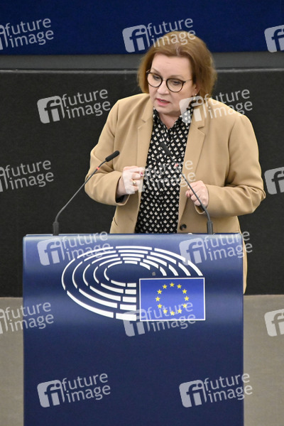 Anna Zalewska bei einer Plenartagung zur Überarbeitung der Marktstabilitätsreserve für den EU-Emissionshandel im Plenarsaal des Europäischen Parlaments. Straßburg, 04.04.2022