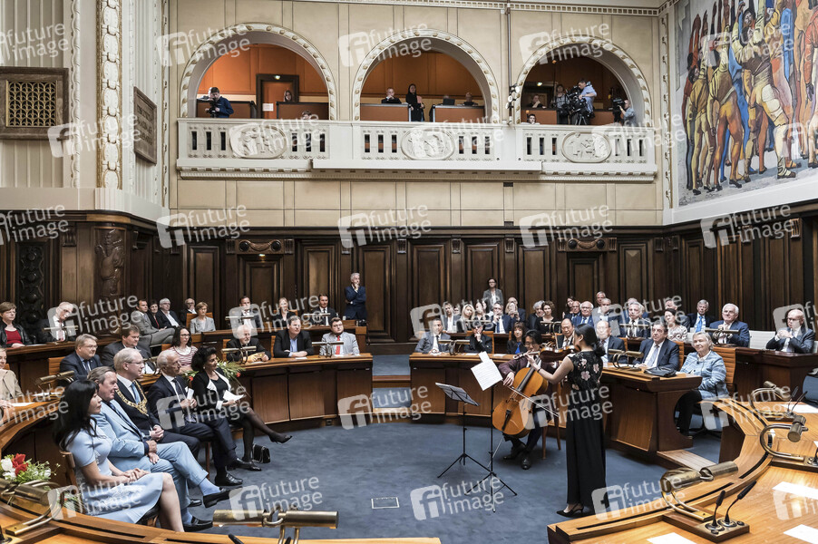 Schröder-Kim So-yeon, Gerard Schröder, Stefan Schostok, Madrid Samii, Mashid Samii und Gäste beim Empfang zum 75. Geburtstag von Ehrenbürger und Bundeskanzler a.D. Gerhard Schröder im Neuen Rathaus. Hannover, 24.04.2019