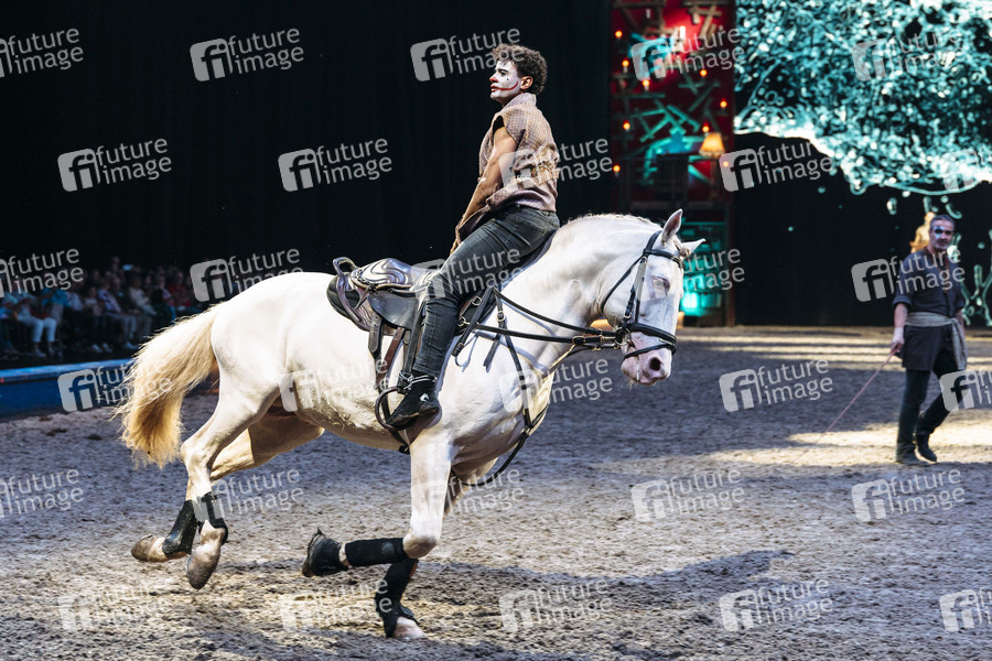 Pferdeshow 'Cavalluna - Grand Moments' mit Reitkunst, Aktobatik und Tanz in der Messehalle. Erfurt, 26.04.2025