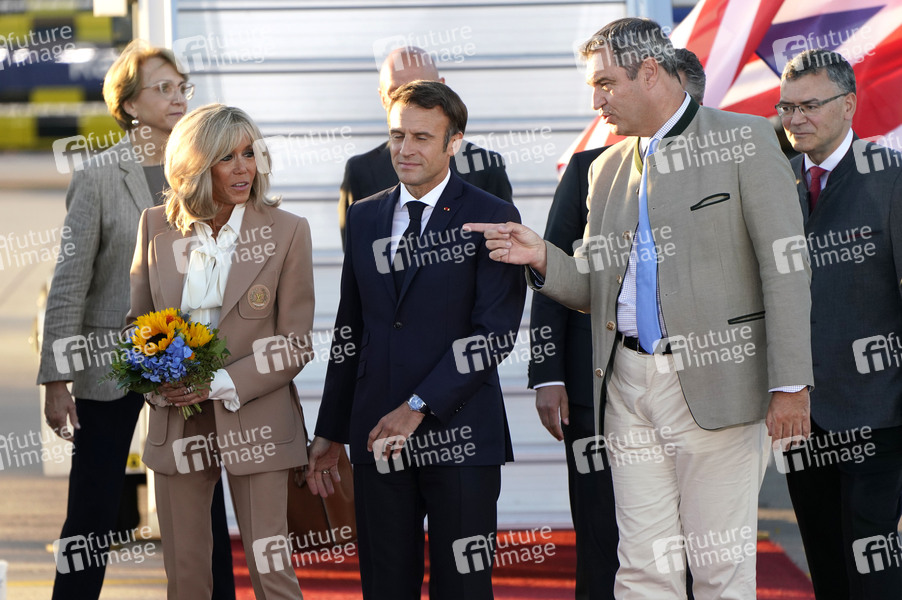Emmanuel Macron mit Ehefrau Brigitte Macron und Markus Söder bei der Ankunft von Präsident Macron zum G7-Gipfel am Flughafen München Franz Josef Strauß. München, 25.06.2022