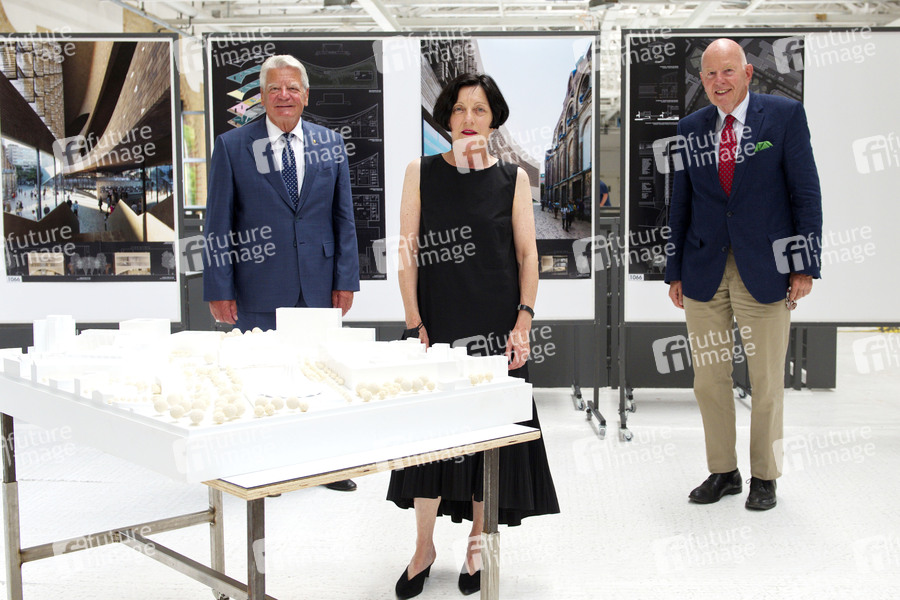 Joachim Gauck, Herta Müller und Christoph Stölzl am Gewinner-Modell vom Büro Dorte Mandrup aus Kopenhagen bei der Pressekonferenz mit Photocall zum Realisierungswettbewerb für das künftige Exilmuseum in der Station Berlin. Berlin, 14.08.2020