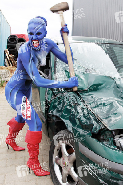 Bodypainting, Erotik, Frau, Mädchen, nackt, draußen, weiblich, Körperkunst, Kunst, Malerei, Auto, Vorschlaghammer, erotic, woman, girl, nude, outdoor, female, body art, body painting, sledgehammer, car