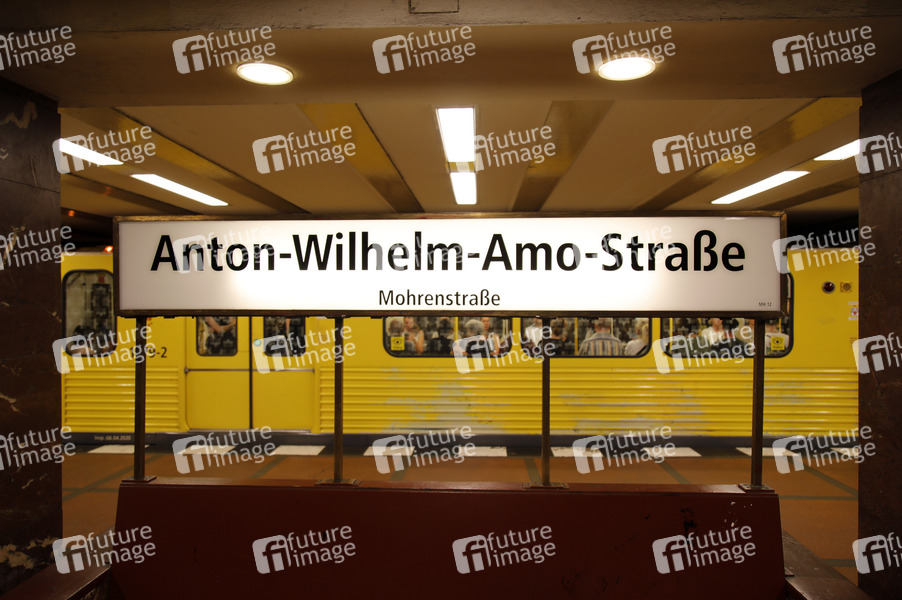 Schild am U-Bahnhof Anton-Wilhelm-Amo-Straße Untertitel Mohrenstrasse. Die Mohrenstrasse ist in Anton Wilhelm Amo Strasse unbenannt worden in Erinnerung an den ersten promovierten Philosophen afrikanischer Herkunft in Deutschland. (Symbolfoto, Symbolbild) Berlin, 27.08.2025