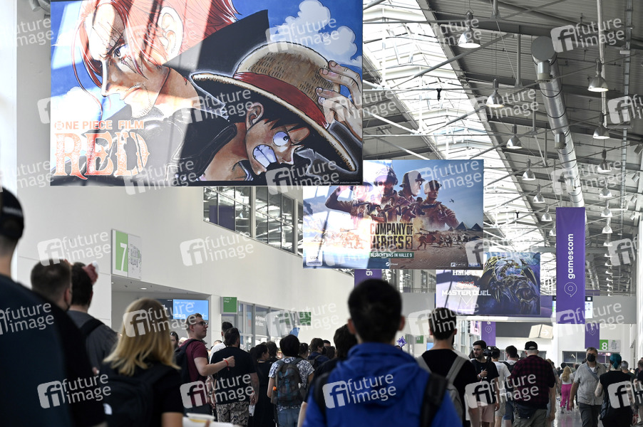 Messebesucher auf der Gamescom 2022 auf dem Gelände der Kölnmesse. Die Gamescom ist die weltweit größte Messe für Computer- und Videospiele, gemessen nach Ausstellungsfläche und Besucheranzahl. Zahlreiche Hersteller aus aller Welt präsentieren hier ihre neue Soft- und Hardware. Köln, 25.08.2022