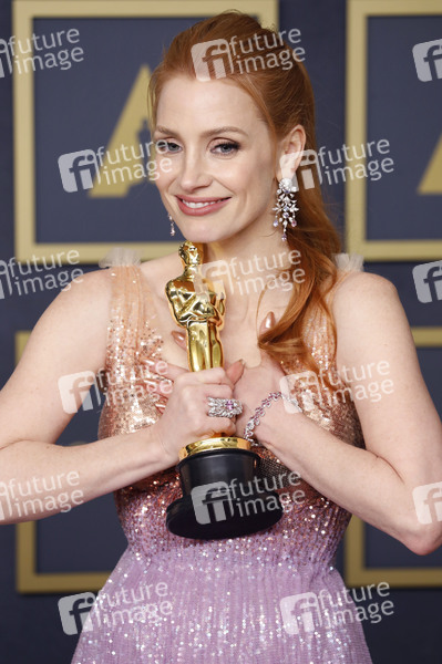 Jessica Chastain mit dem Oscar für die beste Hauptdarstellerin in 'The Eyes of Tammy Faye' im Press Room der Oscar Verleihung 2022 / 94th Annual Academy Awards im Hollywood & Highland Center. Los Angeles, 27.03.2022