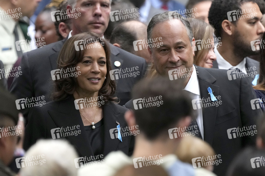 Kamala Harris mit Ehemann Douglas Emhoff bei der Gedenkfeier für die Opfer der Terroranschläge vor 21 Jahren am 9/11 Memorial. Mit Schweigeminuten und der Verlesung der Namen der fast 3000 Todesopfer haben die USA am Sonntag an die Terroranschläge vom 11. September 2001 erinnert. Am früheren Standort des World Trade Centers in New York verlasen Angehörige wie jedes Jahr am 11. September die Namen aller Anschlagsopfer. New York, 11.09.2022