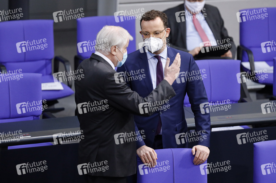 Horst Seehofer und Jens Spahn in der 203. Sitzung des Deutschen Bundestages im Reichstagsgebäude. Berlin, 13.01.2021