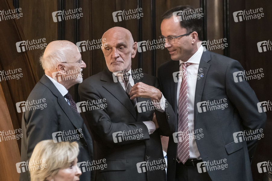 Dirk Rossmann, Martin Kind und Jochen Köckler beim Empfang zum 75. Geburtstag von Ehrenbürger und Bundeskanzler a.D. Gerhard Schröder im Neuen Rathaus. Hannover, 24.04.2019