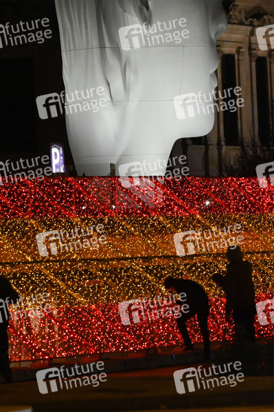 Spanische Flagge Installation auf der Plaza de Colon - Einschalten der traditionellen Weihnachtsbeleuchtung im Stadtzentrum. Madrid 26.11.2020